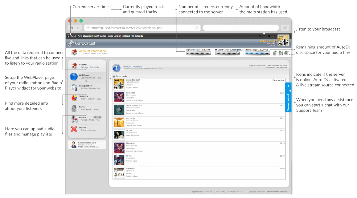 Manage your Internet Radio Station using any web browser. All Server Packages that we offer come with the latest version of Centova Cast Control Panel.