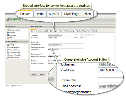 Whether you’re a ShoutCast or IceCast newbie or a seasoned streaming professional, Centova Cast makes it easy to configure your stream.