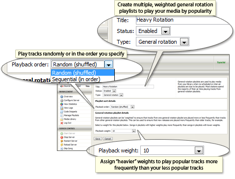 Centova Cast supports multiple playlists for each stream. Each playlist can be configured individually to control precisely how and when it will be played — at a specific time, on a repeating schedule, or on a rotation schedule with support for ranking by popularity (known as “weighting”).