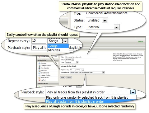 Interval playlists play on a recurring basis, either every few minutes, or after every few songs.