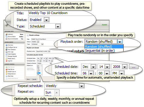 Scheduled playlists are ideal for daily/weekly countdowns, pre-recorded shows, weather forecasts, or any other media that you’d like to have Centova Cast play automatically at a specific time.