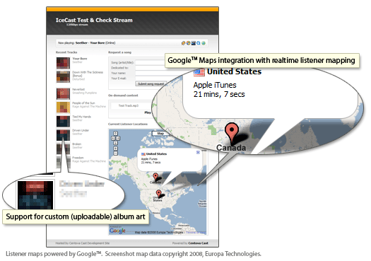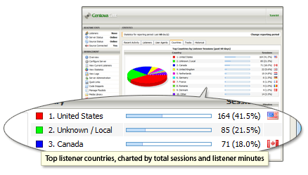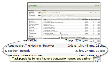 Centova Cast provides the most comprehensive streaming radio statistics system commercially available today. It provides information about listener trends and demographics, data transfer, track performances and popularity, user agents, and much, much more.
