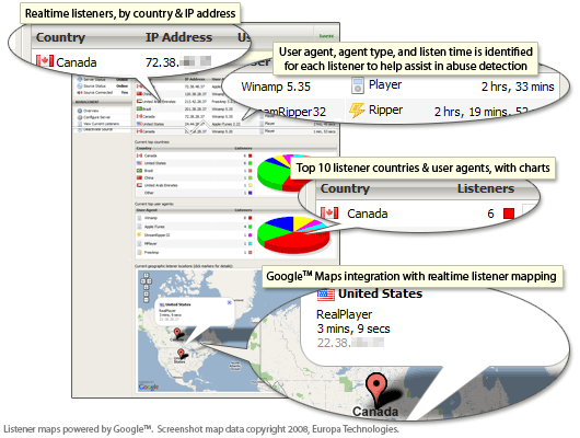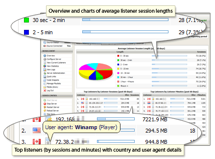 Average session length is charted and graphed, and top listeners are ranked according to listener minutes and number of sessions. Listener countries are automatically determined, and the software used by the listener to tune into the stream is noted and identified as a media player or stream ripper to assist in abuse detection.