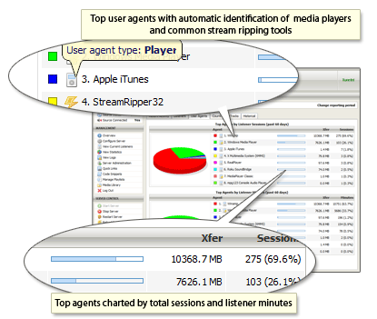 Top user agents are charted and graphed according to listener minutes and number of sessions. Each user agent is also classified as a legitimate media player (such as WinAmp, iTunes, etc.), or a stream ripper (a program used to steal music from your stream) to assist in abuse detection.