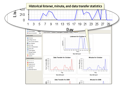 Centova Cast provides detailed daily and monthly data transfer and listener statistics, complete with graphs, allowing both the client and the administrator to track listener trends and resource usage