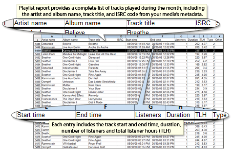 Centova Cast provides monthly, downloadable spreadsheets containing the complete list of songs you’ve played on your stream in the past month, including detailed information about the date, time, and audience of each performance.
